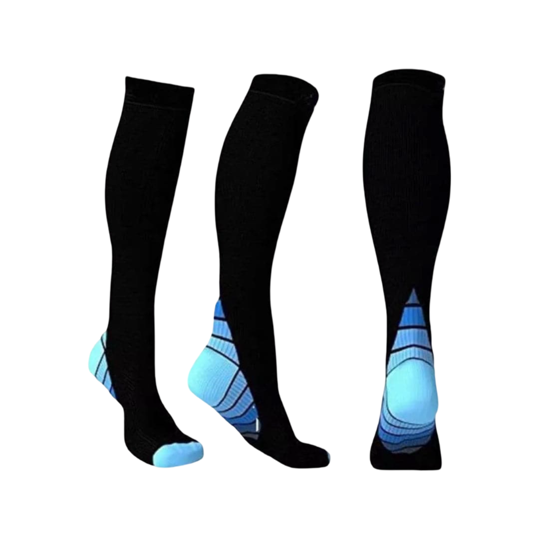 Detta par stödstrumpor är blå, mjuka och bekväma att använda. De bidrar till att främja blodcirkulationen i dina ben och fötter. Genom att göra detta förebygger de åderbråck samt